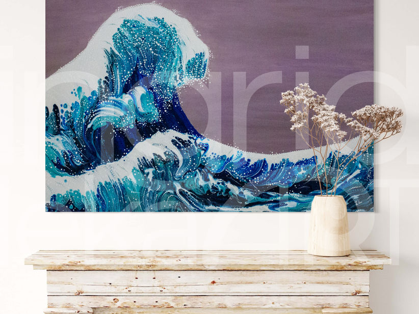 Un omaggio al grande Hokusai, in questa rivisitazione di “The Great Wave off Kanagawa” in arte fluida e dot painting ho cercato di riprodurre la maestosità del mare in tempesta. Sono nata e cresciuta in una città di mare: certamente è piacevole farci un tuffo d’estate quando fa caldo, ma c’è qualcosa nel mare d’inverno che non so spiegare: una sensazione primordiale, di paura e bellezza contemporaneamente. Il mare d’inverno, con le sue onde alte ti fa sentire piccola e fragile e sebbene tu sia contenta di essere sulla terraferma, al contempo non riesci a distogliere lo sguardo da quella bellezza tanto antica quando il mondo.