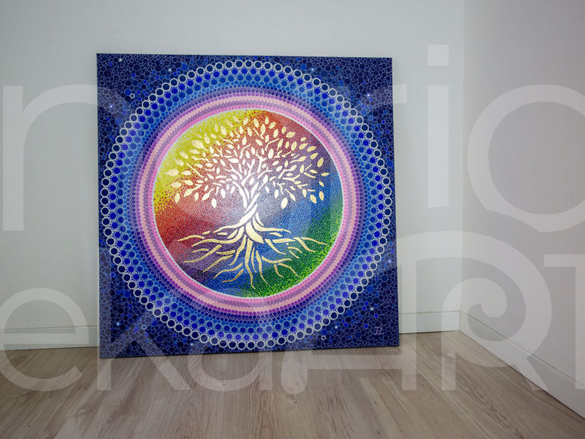 Acrilico su tela, dot painting e utilizzo foglia d'oro imitazione; vernice anti UV brillante.